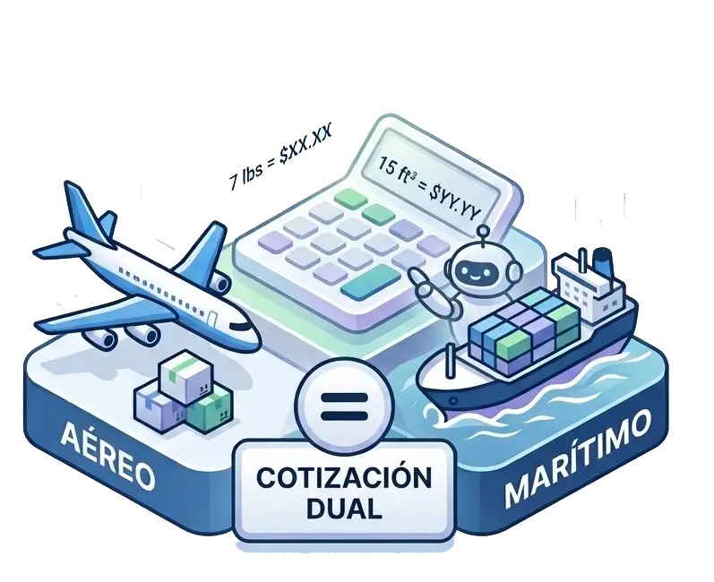 Calcula automáticamente tarifas por libra (Aéreo) y pie cúbico (Marítimo) en una misma solicitud, sin errores manuales.