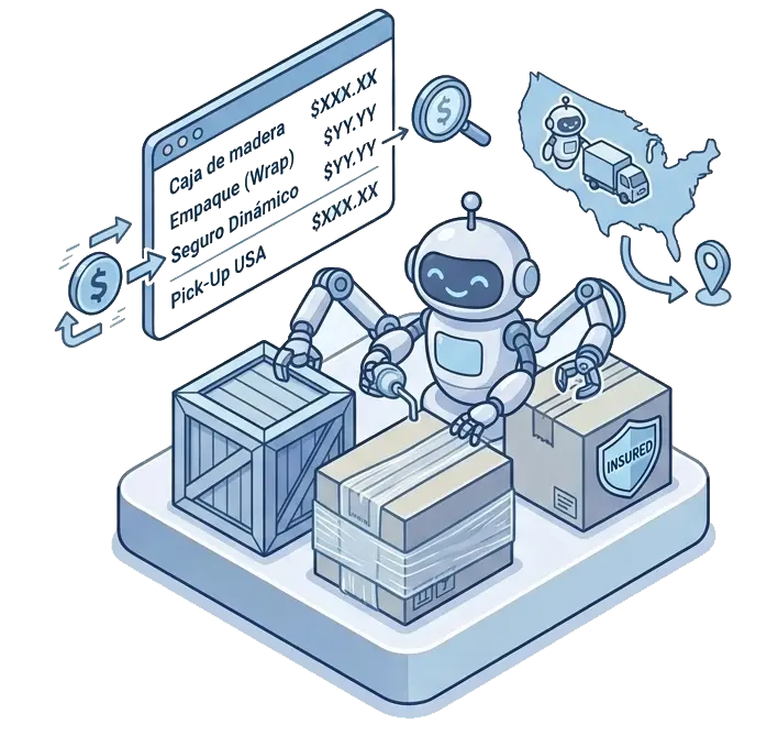 Cobros automatizados por cajas de madera, empaque (Wrap), seguros dinámicos y servicio de Pick-Up en USA.