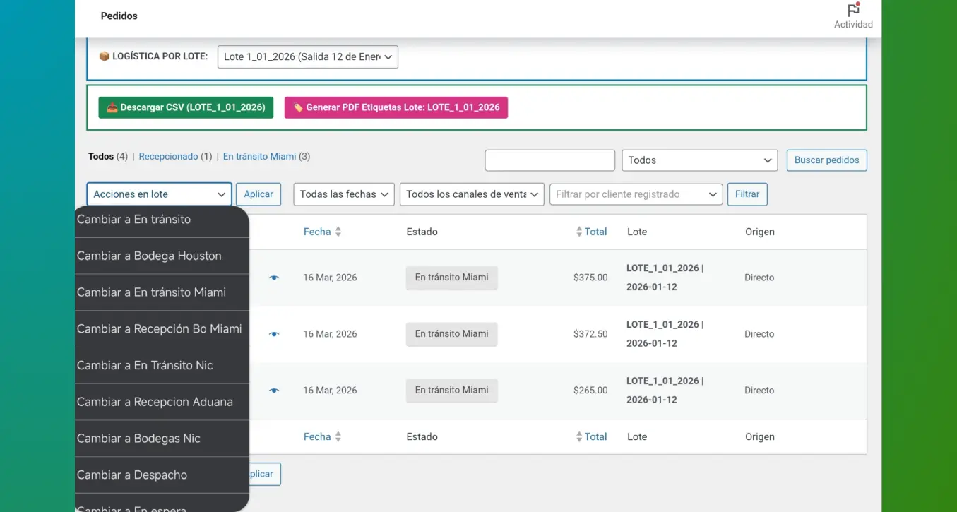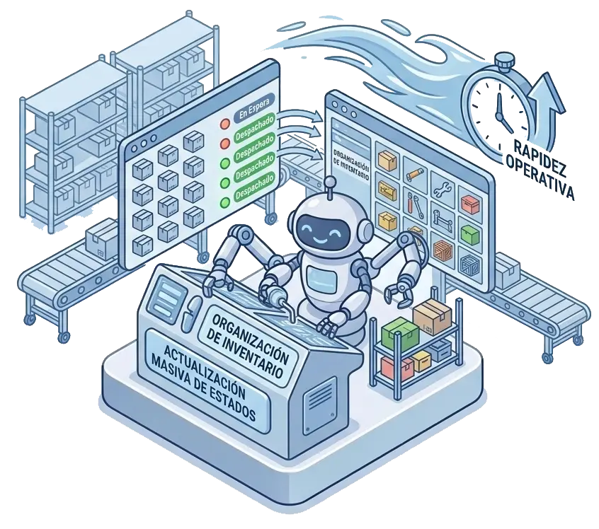 Cambia estados de pedidos masivamente y organiza tu inventario con una interfaz diseñada para la rapidez operativa.