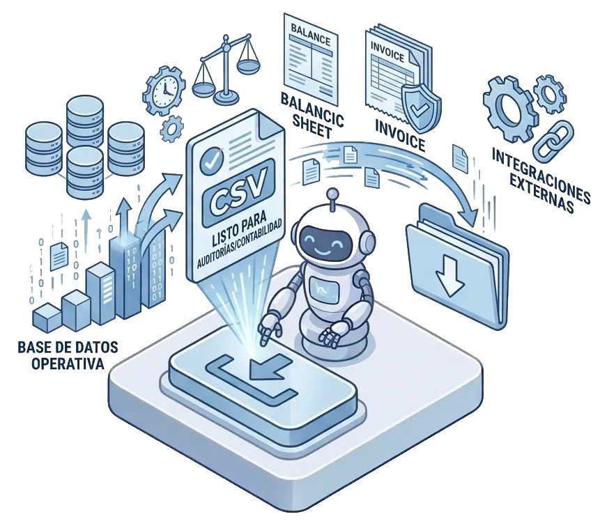 Descarga toda tu data operativa en formato CSV con un clic. Ideal para reportes contables, auditorías o integraciones externas.