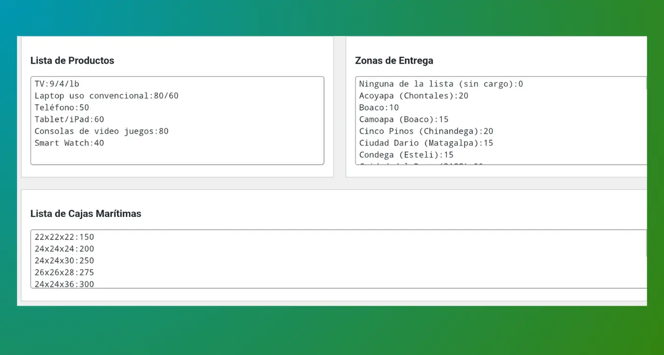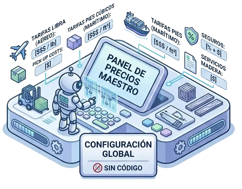 Configura globalmente tarifas de libras, pies cúbicos, seguros, servicios de madera y costos de Pick-Up sin tocar una línea de código.