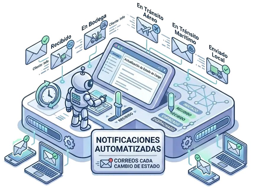 Mantén a tus clientes informados en cada paso. El sistema envía correos automáticos cada vez que el estado de la carga cambia.