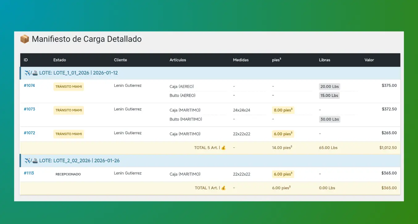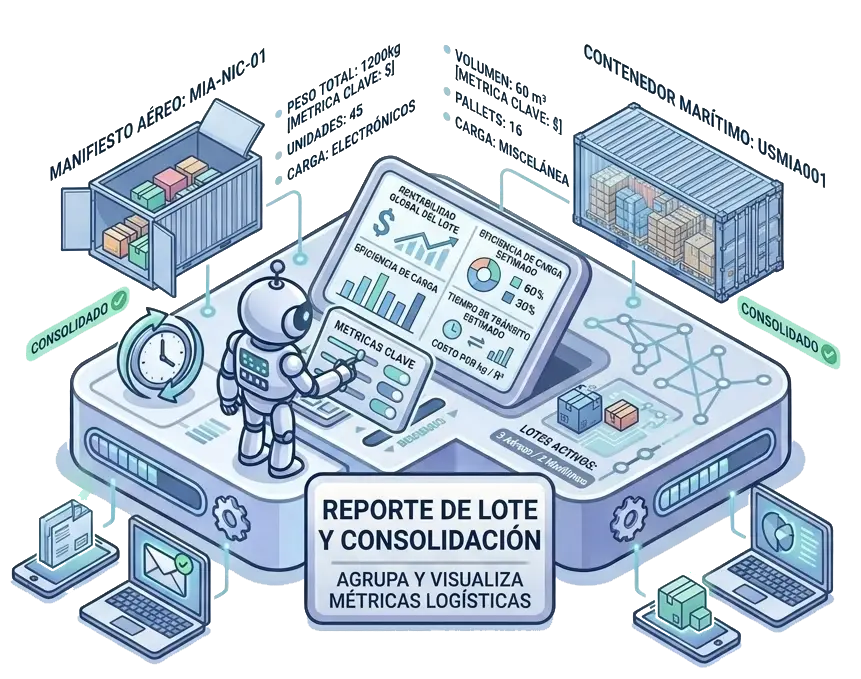 Agrupa pedidos por manifiesto o contenedor y visualiza métricas clave de cada lote para una logística de carga impecable.